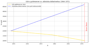 Gul linje: USA:s faktiska guldreserver i ton. Blå streckad linje: Utländska dollarinnehav som motsvarar krav på guld.