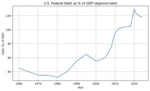 Men om investerare börjar tro att USA inte kan kontrollera sin numera gigantiska skuld (se illustration ovan) eller har en politik som urholkar värdet så blir ju tillgångar i dollar mindre värda och motverkar syftet om en säker hamn. Det kräver dock långvarig hög inflation utan trovärdig Fed. Det är därvid intressant att Trump vill knyta Fed närmare Vita Huset och vill ha sänkta räntor samtidigt som man driver upp inflationen genom att införa tullar som påverkar priset för amerikanska konsumenter. Förtroendet för valutor följer med makt och förtroende. Om USA förlorar militär dominans globalt eller över tid driver en politik som är oförutsägbar – då minskar även förtroendet för valutan.