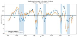 En bra temperaturmätare på hur det står till i konsumenternas förväntningar om framtiden är Konjunkturinstutets konfidensindikator för hushåll som är helt enkelt är ett månatligt mått på hur hushållens framtidstro om sin egen ekonomi. Denna är också del av ett bredare mått – barometerindikatorn, som är ett snitt av framtidstron bland hushållen och näringslivet i stort, en slags nulägesbild om vi är på rätt eller fel väg. När indikatorn är på index 100, markerad av det svarta strecket i bilden nedan, så ligger vi vare sig i mental hög, eller lågkonjuktur. Är vi över 100 så är vi kollektivt mer positiva än annars och under 100 motsvarande mer negativa i vår uppfattning om framtiden. Som det visar sig, om man markerar de tidpunkter när Sverige varit i lågkonjunktur så ser man en stark korrelation, där barometerindikatorn dyker ner, innan lågkonjunkturen inträffar och där det kollektiva medvetandet också vänder till positivism innan högkonjunkturen inträffar.